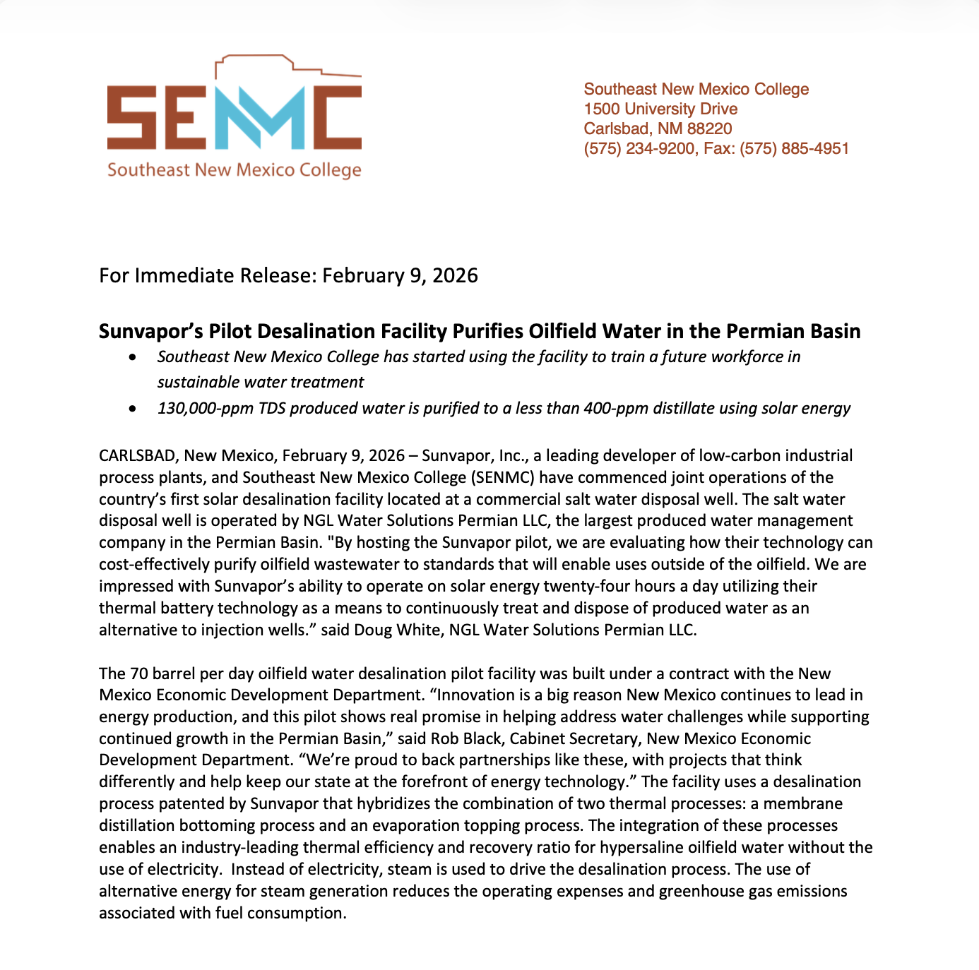 “Innovation is a big reason New Mexico continues to lead in energy production, and this pilot shows real promise in helping address water challenges while supporting continued growth in the Permian Basin”
